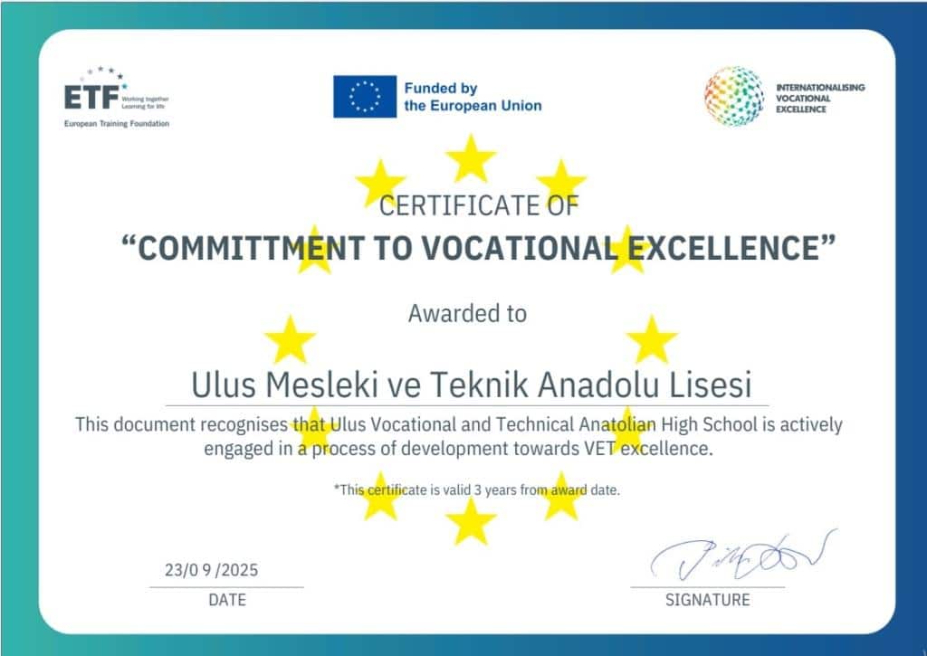 Okulumuz, bu sertifika ile mesleki eğitimde öncü ve örnek okullar arasında yerini almıştır.