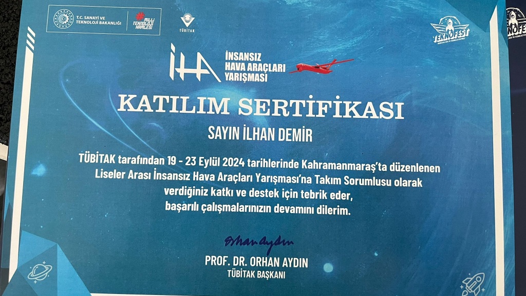 Teknofest 2024 Liselerarası İHA yarışmasında Tuğberk İHA takımımız önce 1600 takım arasında jüri tarafından seçilen 80 takım arasına girmiş, daha sonra görev videosuyla 29 finalist takımdan biri olmuş, 19-23 Eylül 2024 tarihleri arasında Kahramanmaraş ilimizde gerçekleştirilen finallerde 29 takım arasında 57,5 puanla 11.sırada tamamlamıştır. 55 puan barajını geçtiği için Performans Ödülüne layık görülmüştür.